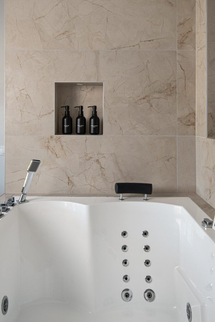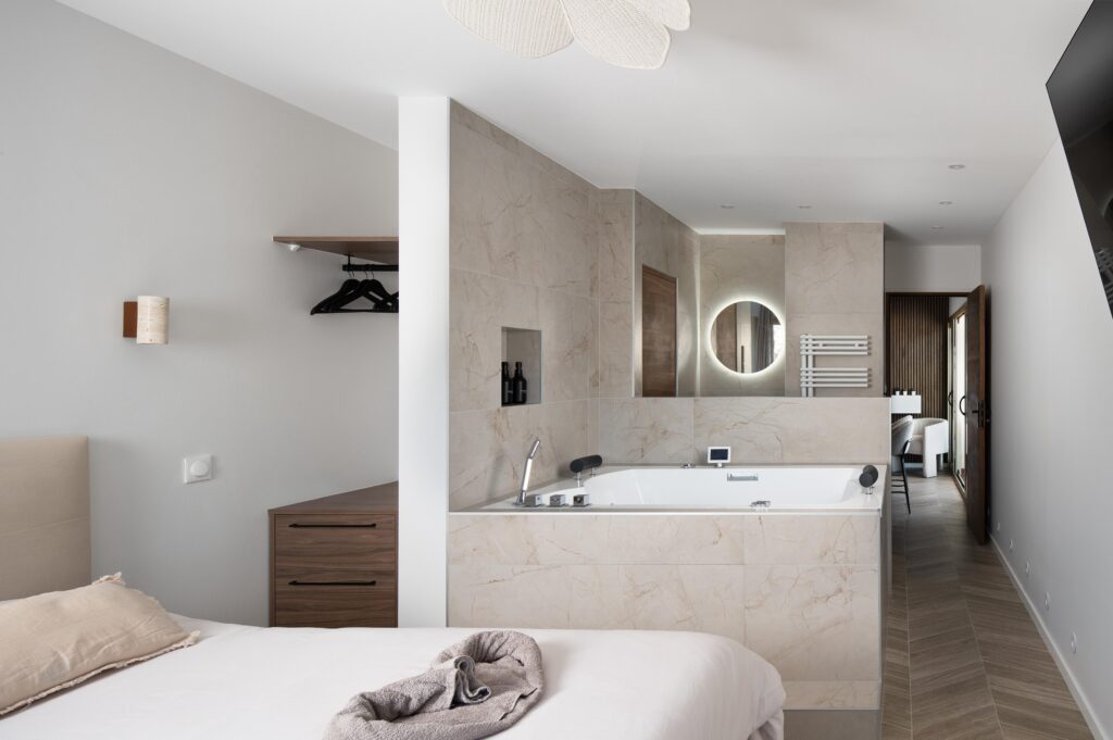 L’objectif : optimiser le potentiel du bien afin d’offrir aux futurs locataires un confort digne d’un hôtel. L’aménagement a été entièrement repensé, de l’esquisse aux dessins d’agencements et au choix du mobilier. La salle de bains a été recréée intégralement, intégrant une balnéo centrale comme véritable expérience de détente. Un travail minutieux sur les rangements permet de maximiser chaque mètre carré, tout en préservant l’harmonie et la fluidité de l’espace.
