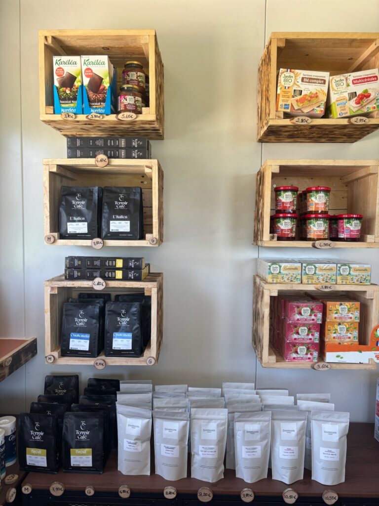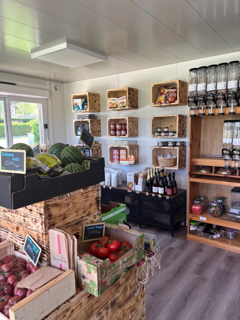 Le projet a permis de créer plusieurs espaces complémentaires : un espace de vente pour les produits de l’épicerie, un salon de thé avec places assises, relié à une zone de préparation pour les pâtisseries et déjeuners.
