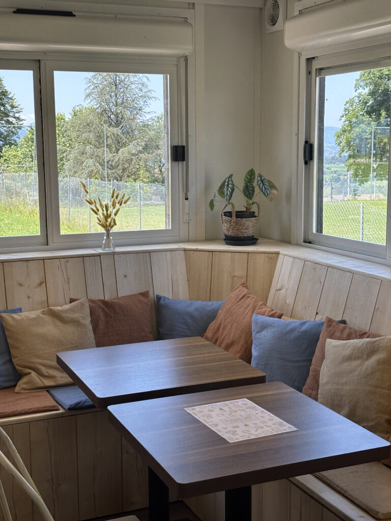 En accord avec la démarche de la cliente, les aménagements ont été conçus à partir de matériaux de récupération : bois, mobilier, et touches de terracotta et de jaune pour un résultat authentique et durable. L’univers s’inspire du concept store, mêlant proximité et convivialité, entre âme du village et esprit citadin.